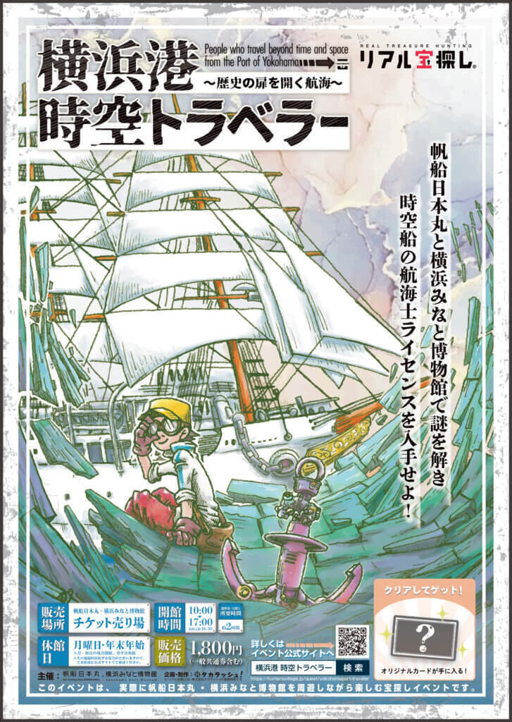 「横浜港時空トラベラー」という名のキットを購入して謎を解き、航海士ライセンスを手に入れる、リアル宝探し、謎解きのイベント(企画・制作:株式会社タカラッシュ)。帆船日本丸がメンテナンス休館中のため、横浜みなと博物館のみでの体験になります。横浜港で歴史の扉を開く航海にぜひチャレンジしてみてください。
