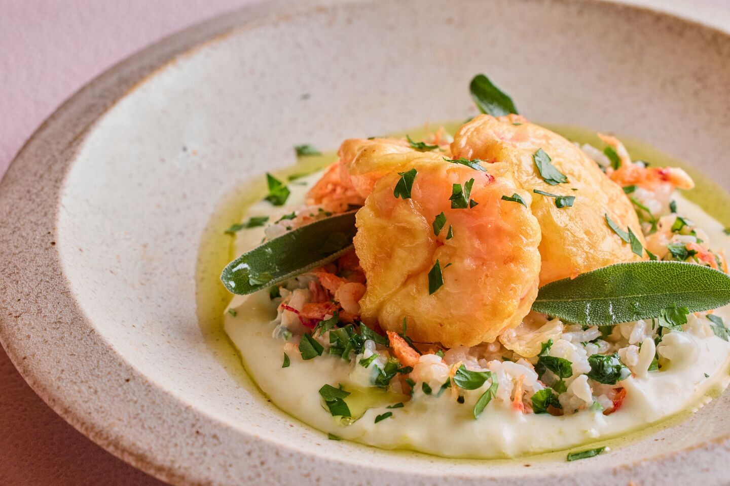 ディナー限定!海老ピカタ 桜エビと春菊のリゾット 香草レモンクリーム