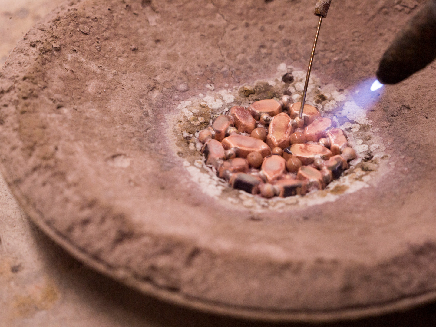 「よせもの」は、「寄せ粉(よせこ)」と呼ばれる泥の上に真鍮のパーツをピンセットで並べ、ガスバーナーで溶接(ろう付け)して形作る、非常に繊細な技術です。かつては女性の着ける一般的なアクセサリーから、ティアラや舞台衣装の装飾を支えてきましたが、現在その担い手は激減しています。