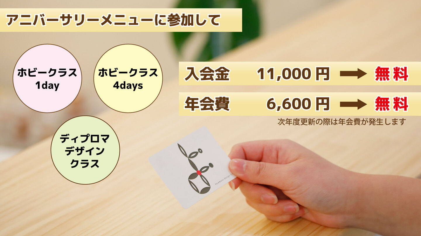 期間中、対象クラスへご参加・会員登録をいただいた方を対象に、入会金(¥11,000)および初年度年会費(¥6,600)を無料とさせていただきます。