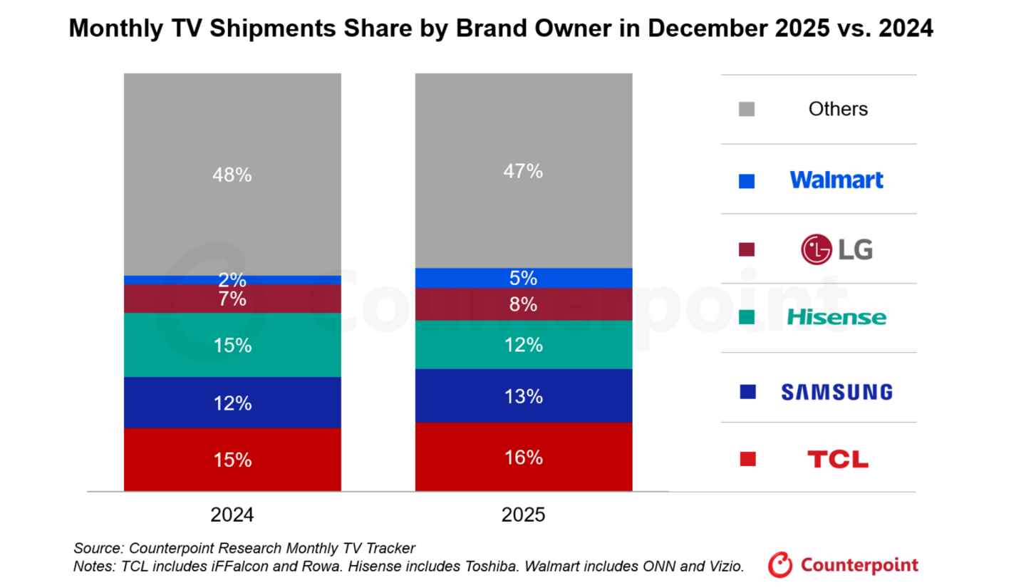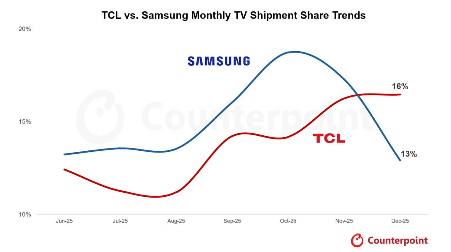 カウンターポイントリサーチ (英文名: Counterpoint Research 以下、カウンターポイントリサーチ社)は、TCLは2025年12月の世界テレビ出荷台数でSamsungを抜き、首位に立ったという調査結果を含むGlobal Monthly TV Trackerによる最新調査を発表致しました。
