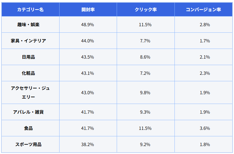 「食品」はクリック率とコンバージョン率が他カテゴリーと比較して高いのが特徴です。「買い忘れ」や「後で買おう」としていたユーザーに対し、メールが購入のきっかけ(トリガー)として強く作用している可能性があります。