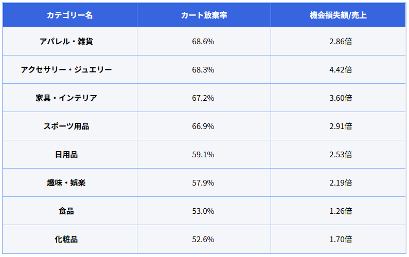 「アパレル・雑貨」や「アクセサリー・ジュエリー」は、カゴ落ち率が7割近くに達しています。これらは嗜好性が高く、デザインや価格を他店とじっくり比較検討する傾向が強いためと考えられます。