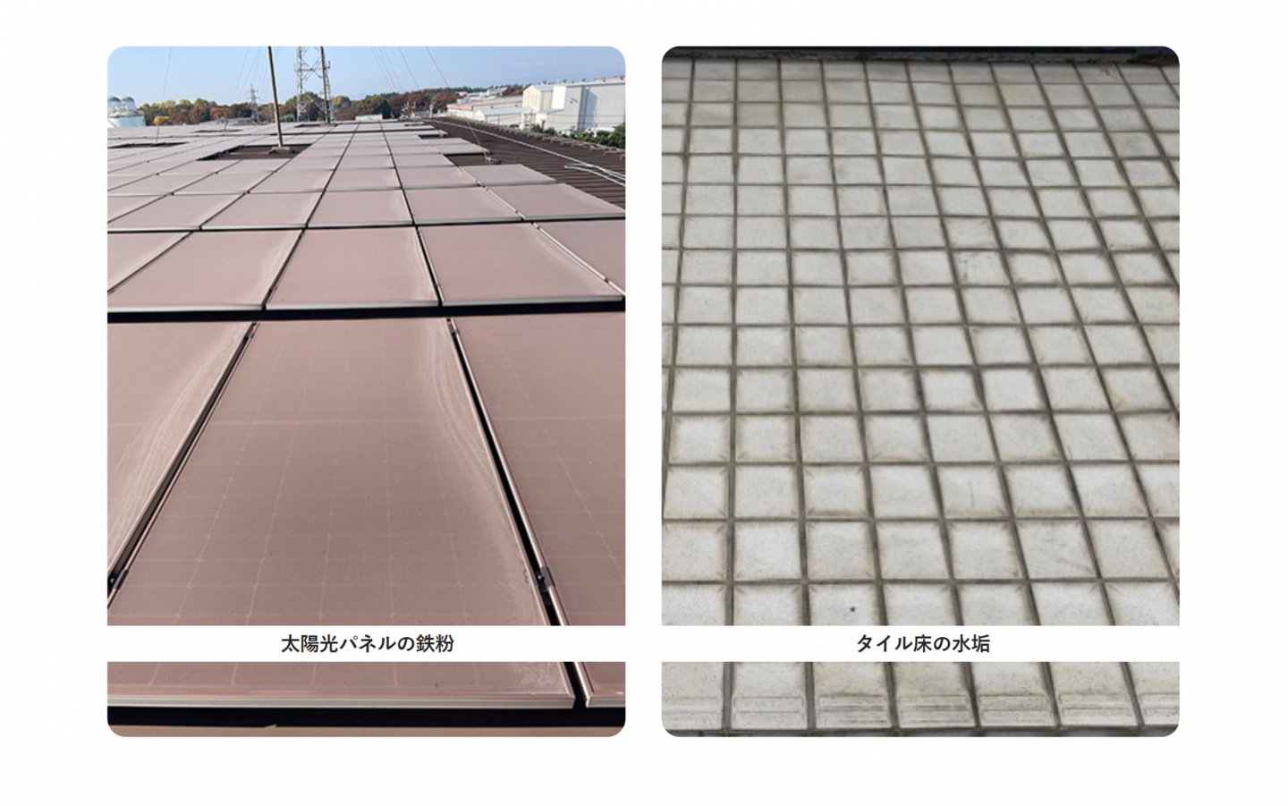 1.製鉄所周辺などで付着しやすい鉄粉や、長年の水垢・スケールなどの汚れが、通常の洗浄剤では除去に時間がかかる