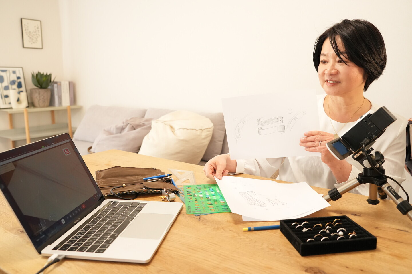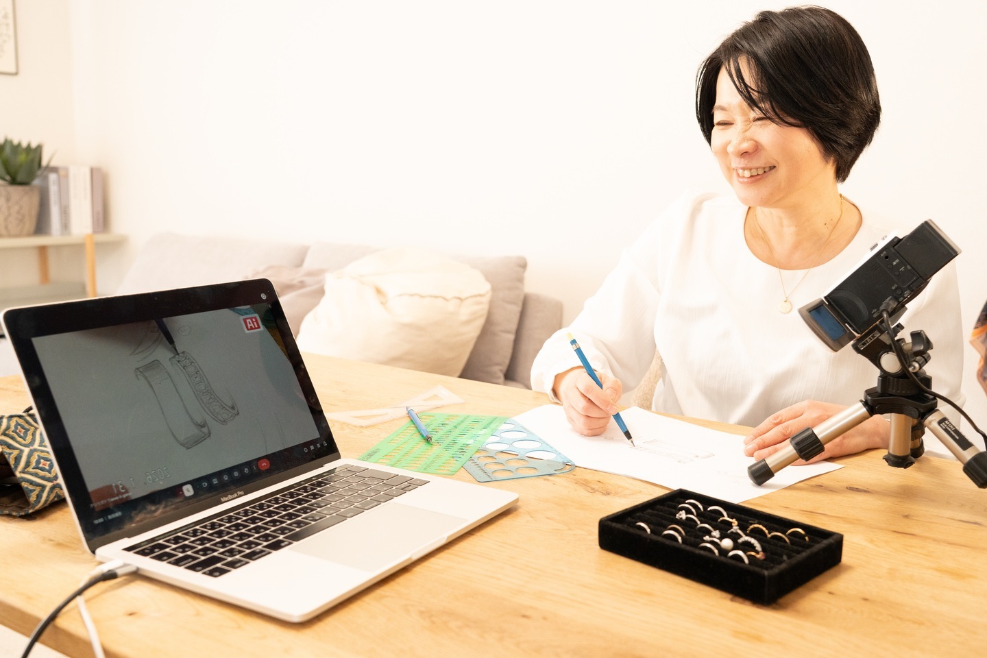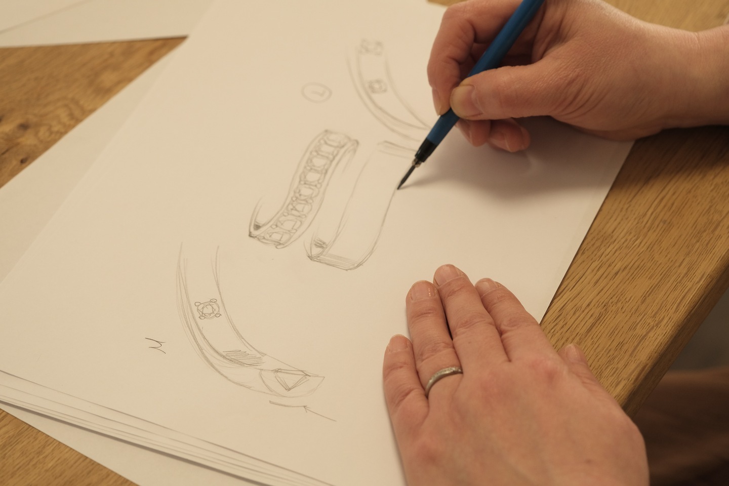 オンライン会議システムを通じ、お客様の目の前でリアルタイムにジュエリーのデザイン画を描き上げる独自の手法です。これまでに「自分のイメージがその場で形になる感動がある」「対面よりも細部まで確認できる」と高い評価をいただいております。