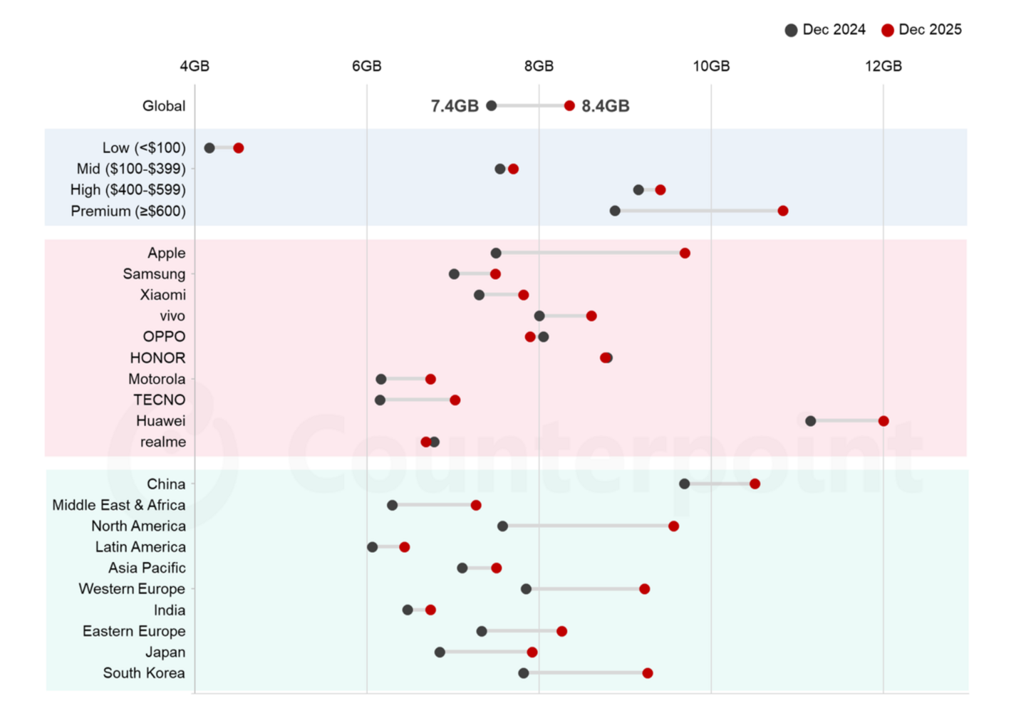 図: 価格帯/ブランド/地域別によるスマートフォンにおけるグローバル平均DRAM容量・2024年12月と2025年12月の比較