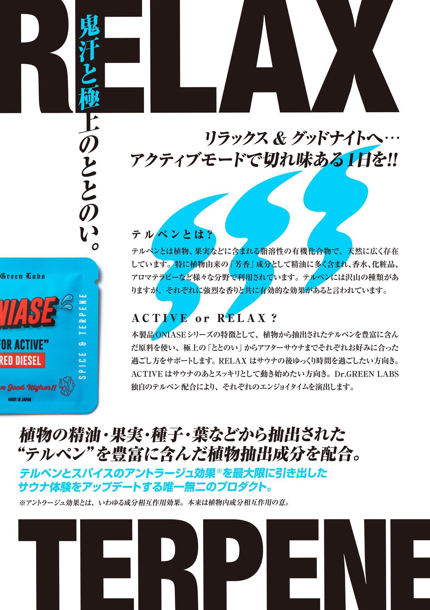 スパイスの配合とテルペンの配合を2種類に分けたことにより、RELAXとACTIVEと2つのととのいと、それぞれのアフターサウナをお過ごし頂けます。