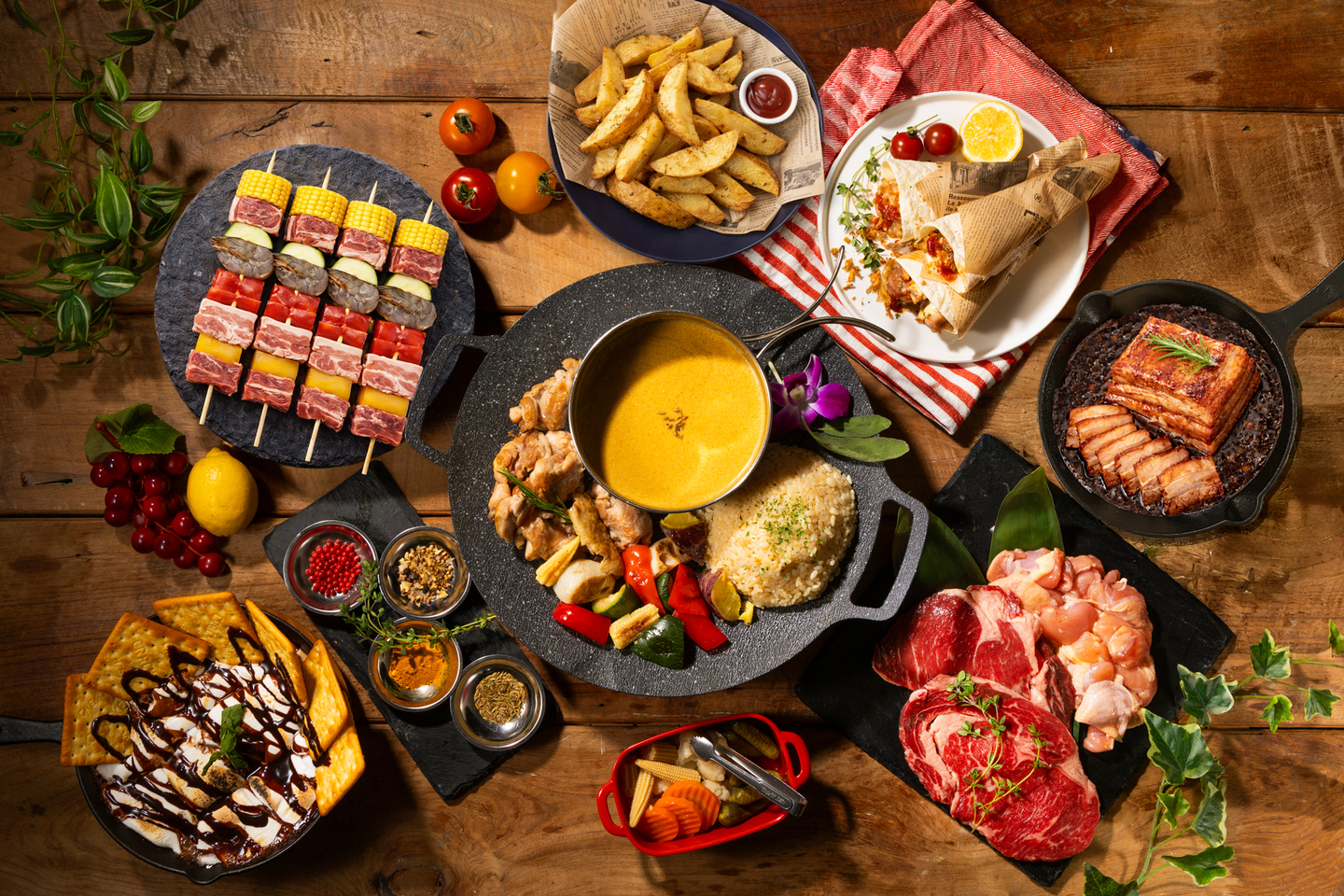 1名4,000円〜4つのBBQ&グランピングコースをご提供。黒毛和牛ステーキ、牛リブロースステーキなどの各種牛肉のBBQ、野菜や鶏肉をグリドルの上で焼いて作る南国風スパイシーカレー夏限定でパテやバンズから焼き上げる自家製ハンバーガーなどいろんなお肉やBBQ料理をお楽しみいただけます。キッズ専用のBBQセットもご用意しておりますのでお子様連れでもご安心ください。