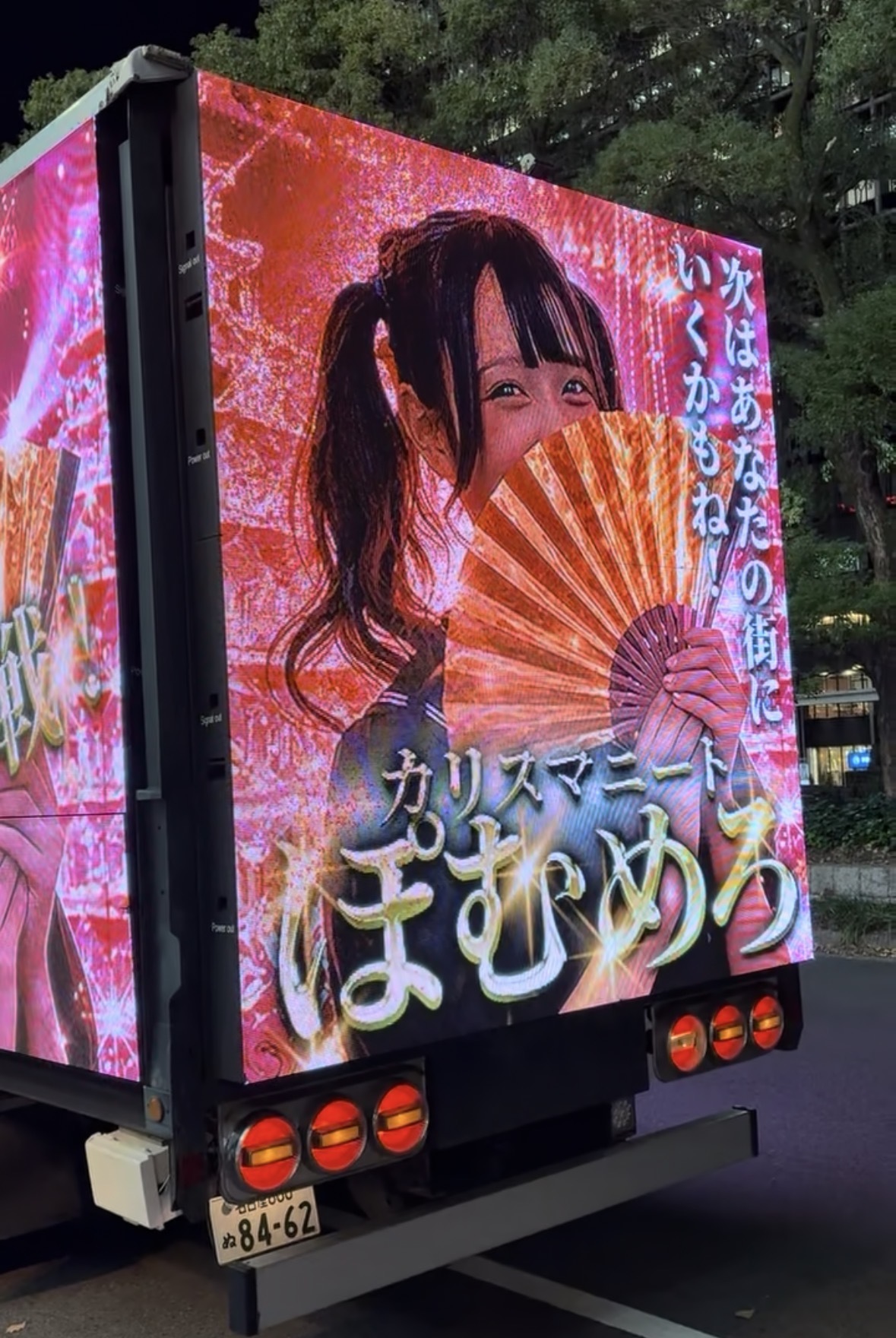 今回走行を開始したアドトラックは、ピンクとゴールドを基調としたネオン調のデザインを採用しております。車体には扇子で口元を隠した『ぽむめろ』の巨大ビジュアルと共に、「1000万PLAYER」「電撃参戦」「次はあなたの街にいくかもね!」という文字を大きく掲示し、視覚的なインパクトを重視して制作いたしました。