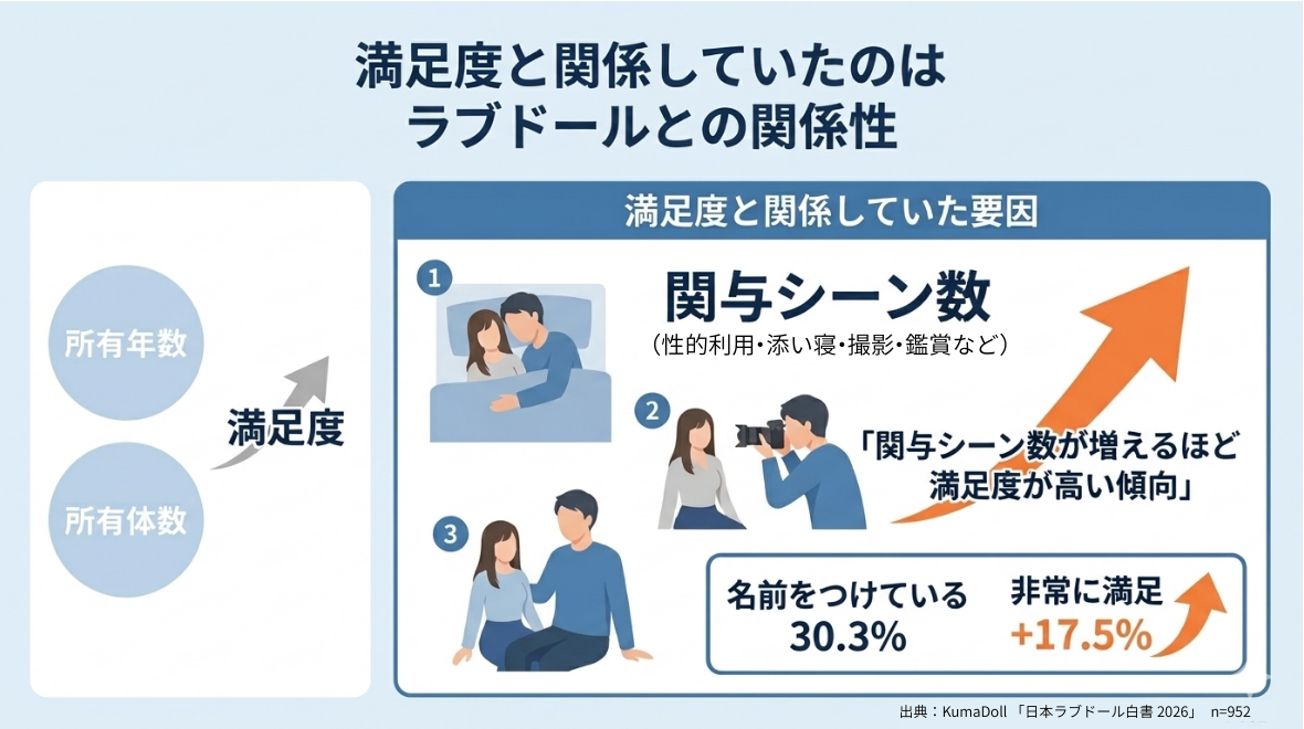 回答を分析すると、満足度は性的利用の有無や所有体数よりも、関わり方の多様さと強く関連していました。