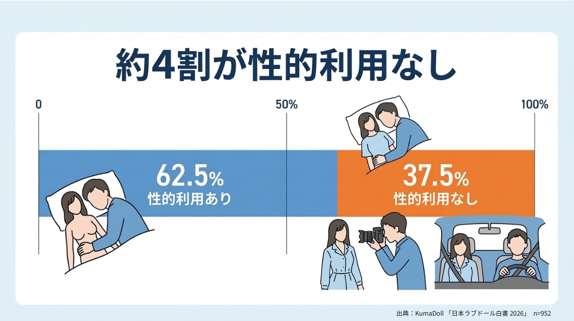 ラブドールは、一般的にアダルトグッズとして認知されていますが、実際の利用実態を見ると、性的利用は62.5%にとどまりました。