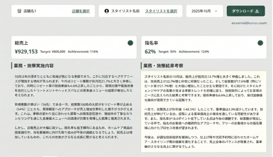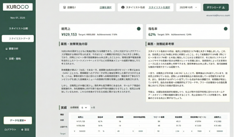 KUROCOは、データとAIを「現場の負担を増やす仕組み」ではなく、「現場が迷わず動ける仕組み」として実装することを重視しています。美容サロン業界のマネジメントが、属人的な勘や個人の努力に頼らずとも成果に近づける状態をつくり、経営者・店長・スタッフそれぞれが納得して前進できる運営モデルの普及に取り組んでまいります。