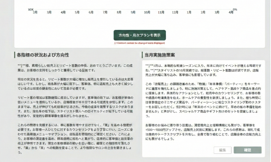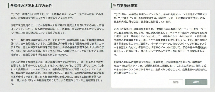 マネージャーが当月実施施策案を「この提案は現場に合わない」と修正すると、AIが即座に学習。使い込むほど、そのサロンを知り尽くしたパートナーのような存在に育ちます。