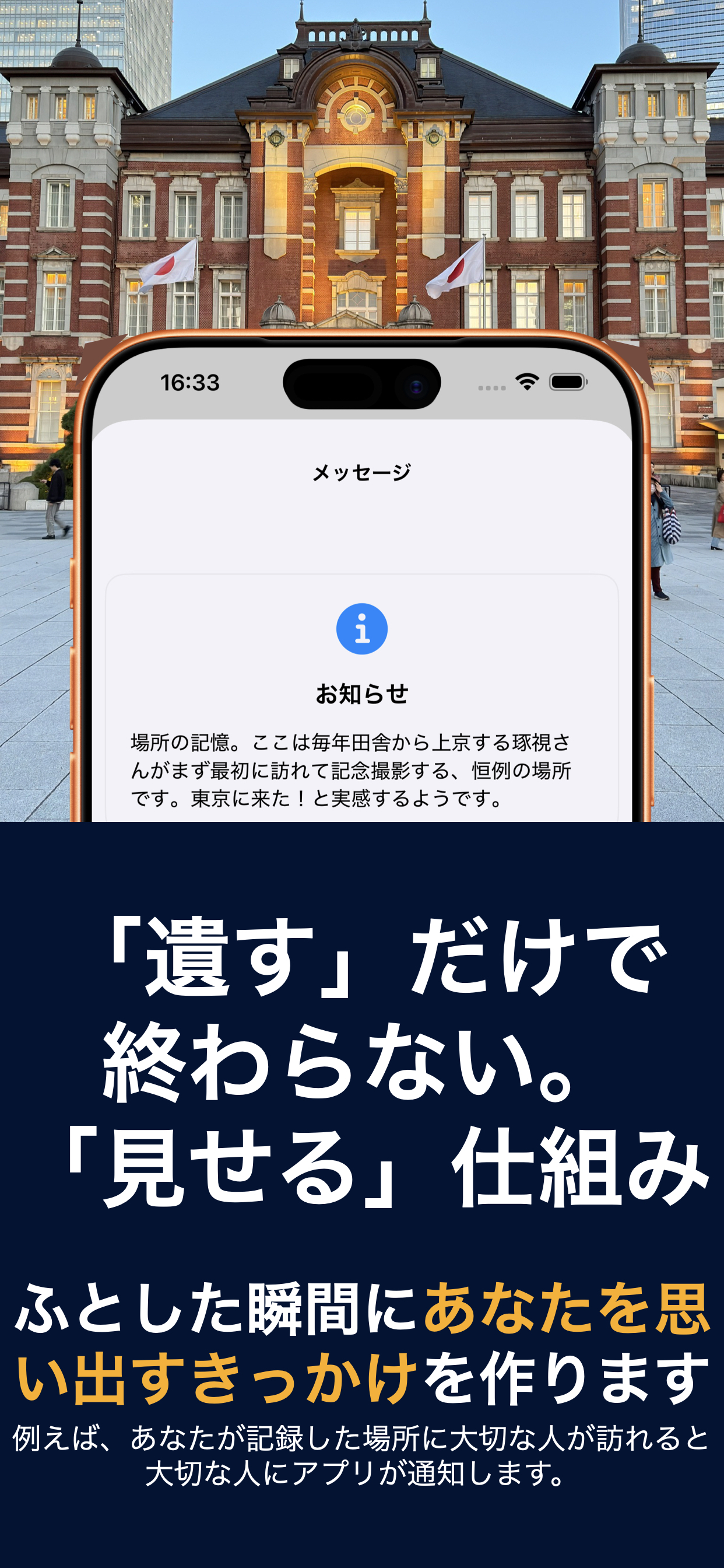 指定した未来の日時(例えば子どもの成人祝い、結婚記念日など)にメッセージを自動配信。思い出の場所を訪れた瞬間に通知が届く場所連動機能も搭載しています。この仕組みは