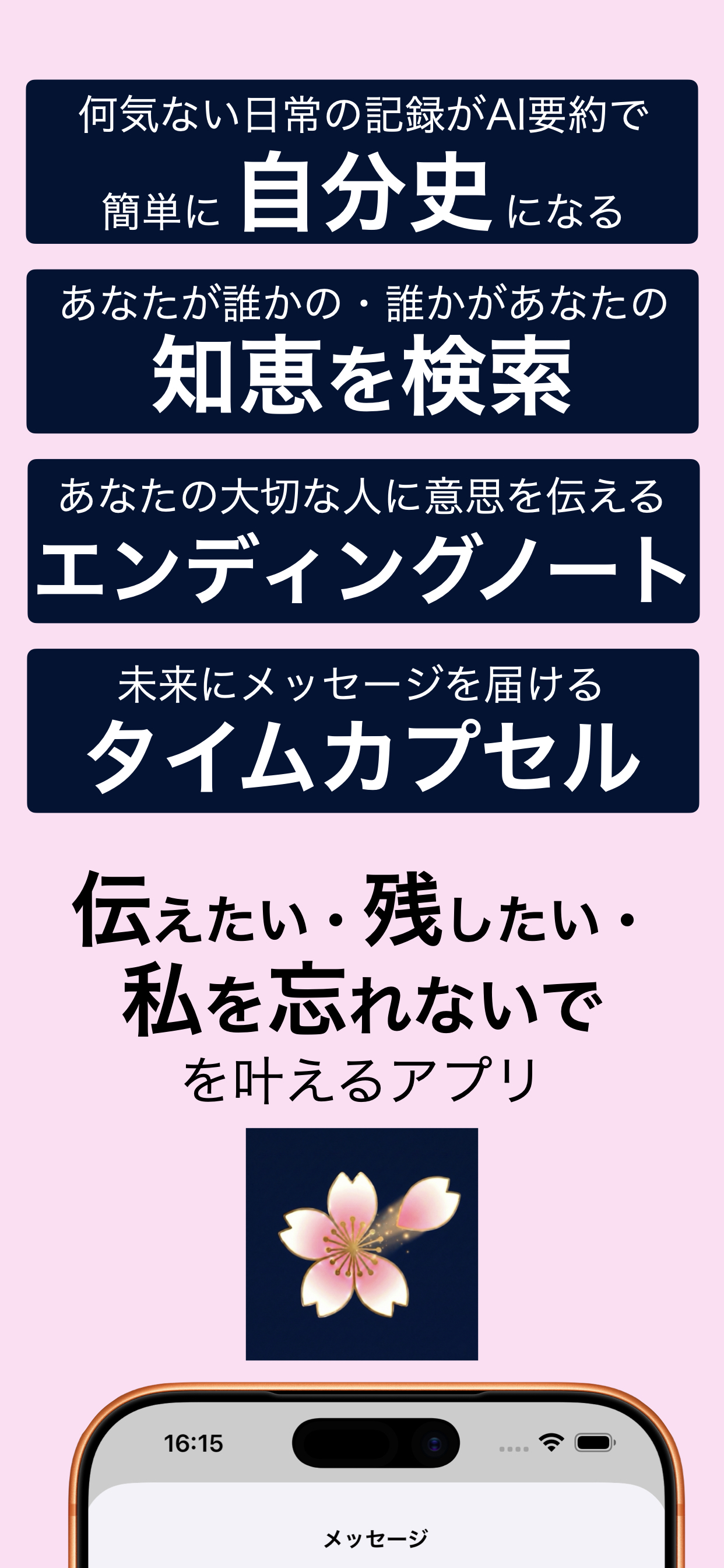 『mmento mori』は公開SNSのリスクを回避し、本当に大切な人にだけ面と向かって言うのは照れ臭い想いや教訓を確実に届ける――デジタル時代の新しい家族の絆を支えるデステックアプリです。