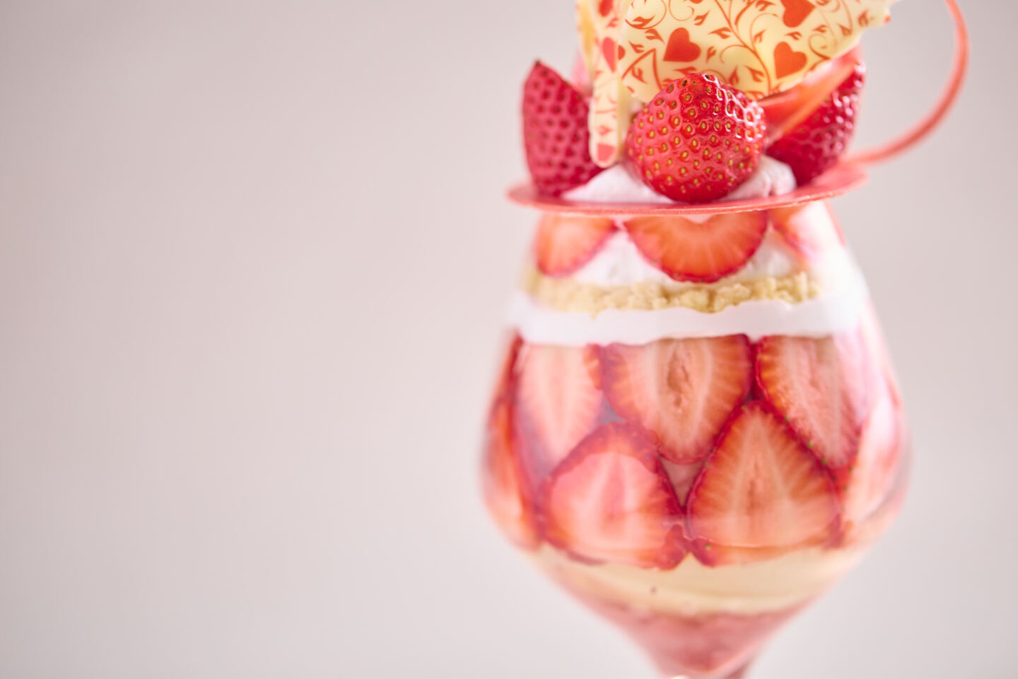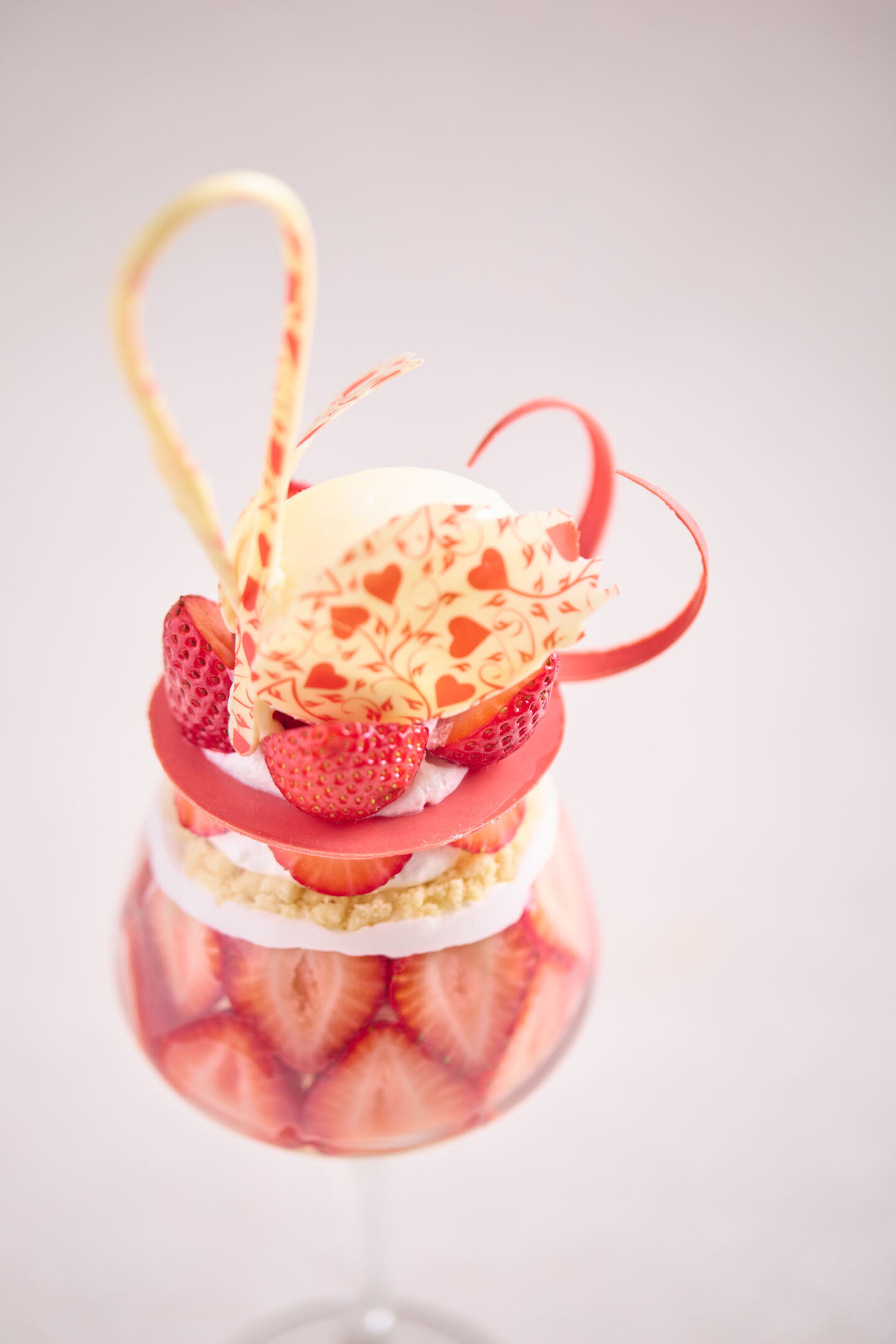 トップには、白鳥の羽ばたきを思わせる繊細なチョコレート細工と真っ赤な苺。これまでの“層を見せる”グラスから一新し、苺の断面を美しく見せる新しいグラスへと変更しました。視覚でも楽しめる、より魅力的なビジュアルに生まれ変わっています。