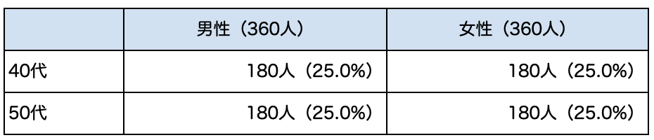 下表の通り男女、各年代とも均等なサンプルになっています。