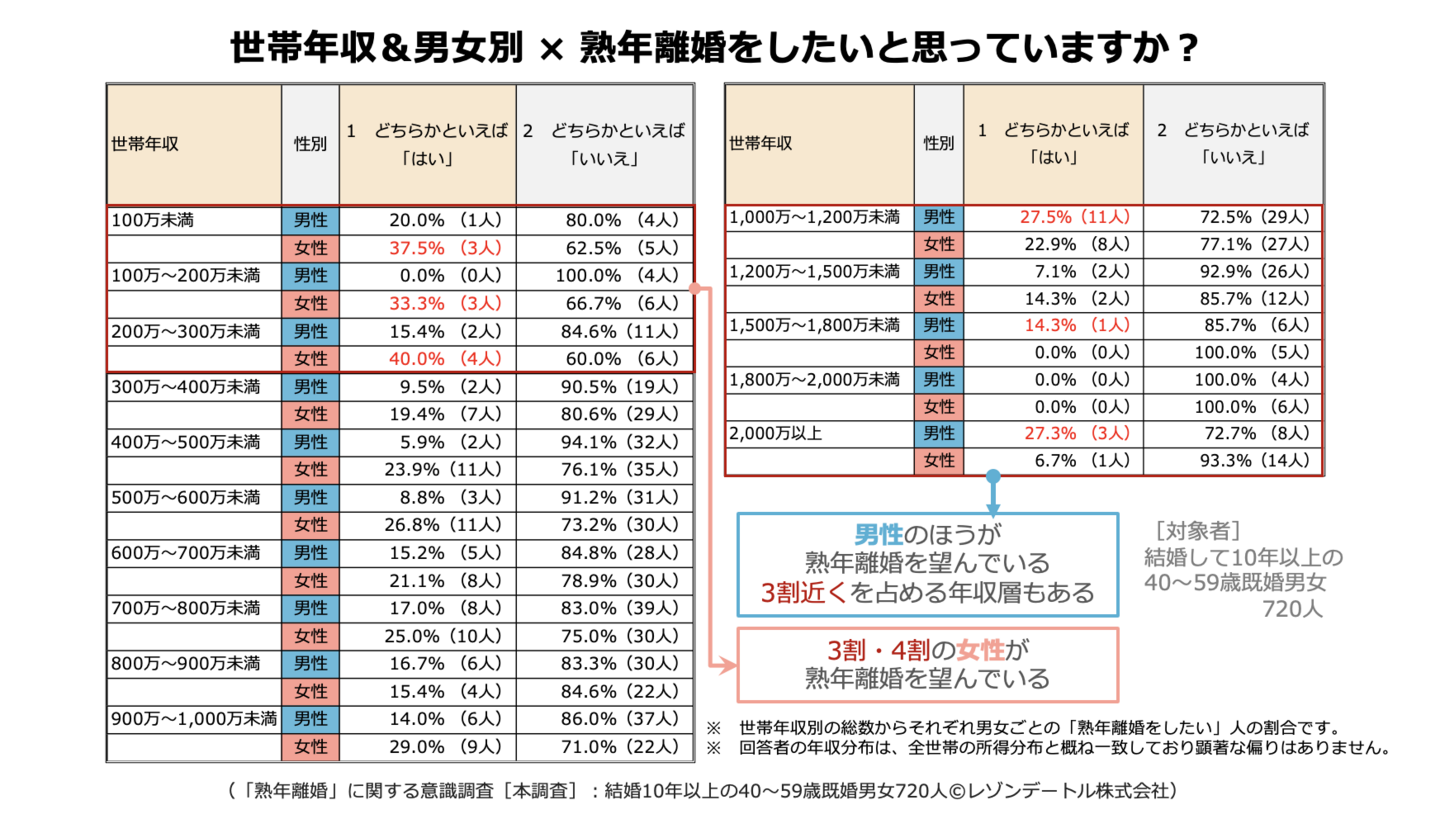 → 低年収層の人に「熟年離婚したい」多く、2〜3割以上に上る