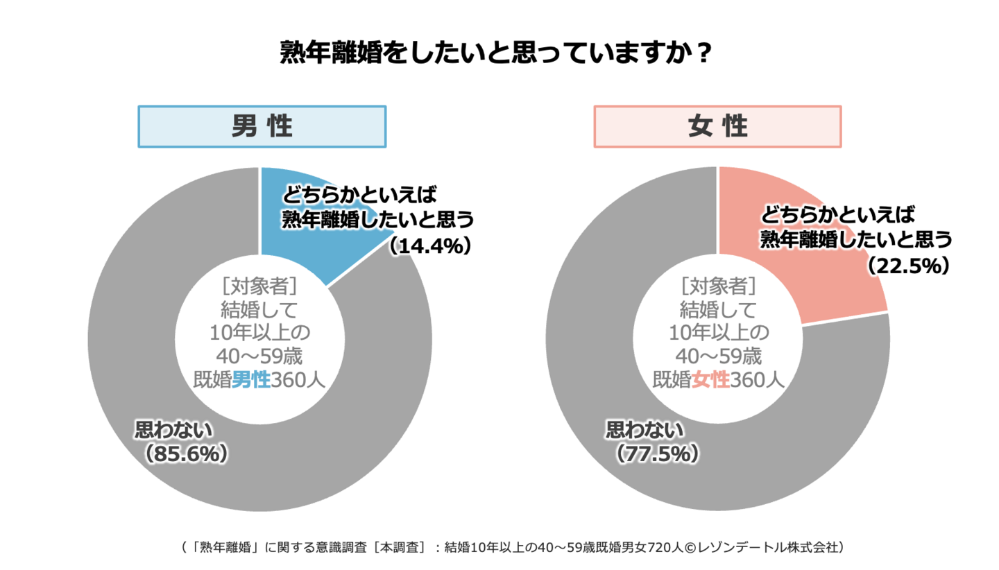 男性は生活面で配偶者への依存度が比較的高く、孤独を感じやすい傾向もあることから、熟年離婚を積極的に望む意向は、女性より低いことがうかがえます。