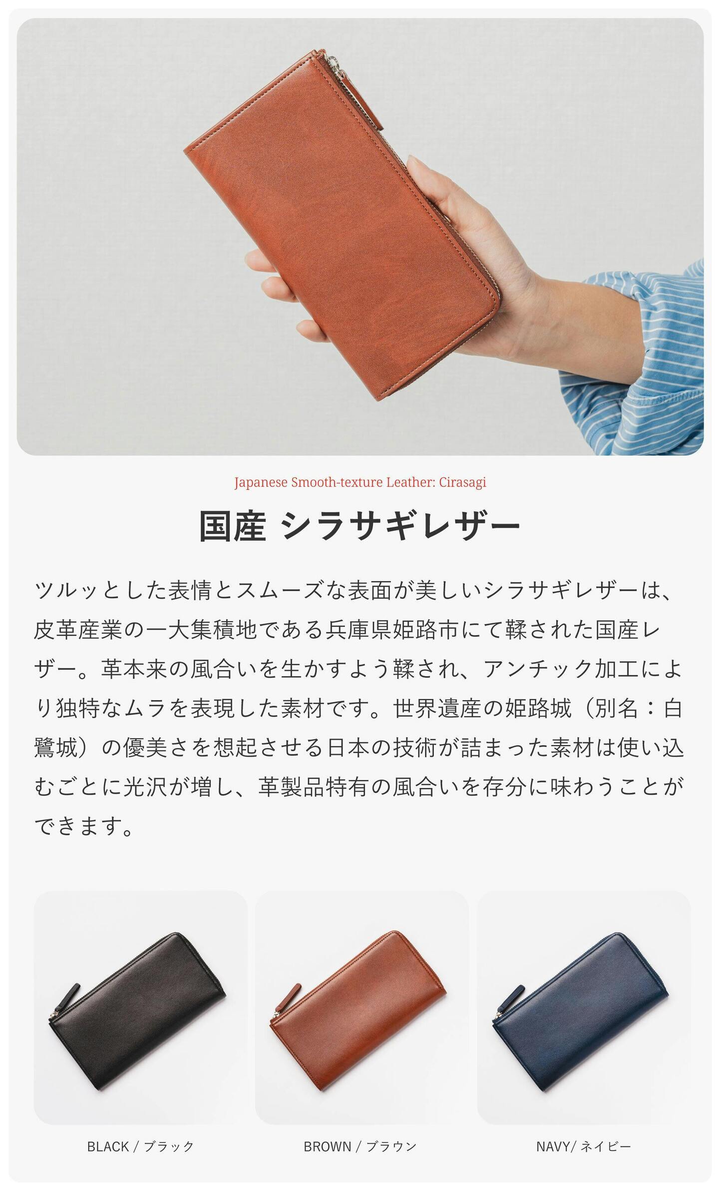 シラサギレザーは、「CYPRIS」で一番人気のオリジナルレザー。皮革産業の一大集積地である兵庫県姫路市で鞣された国産革で、世界遺産の姫路城(別名:白鷺城)にちなんで名付けられた牛革素材です。