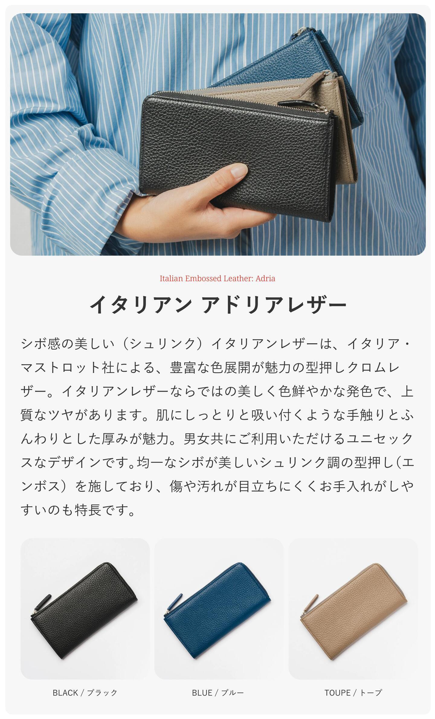 フラットで光の反射が美しい国産シラサギレザーと、レザーらしいシボ感と柔らかさのあるイタリアンアドリアレザーの2種類を展開。
