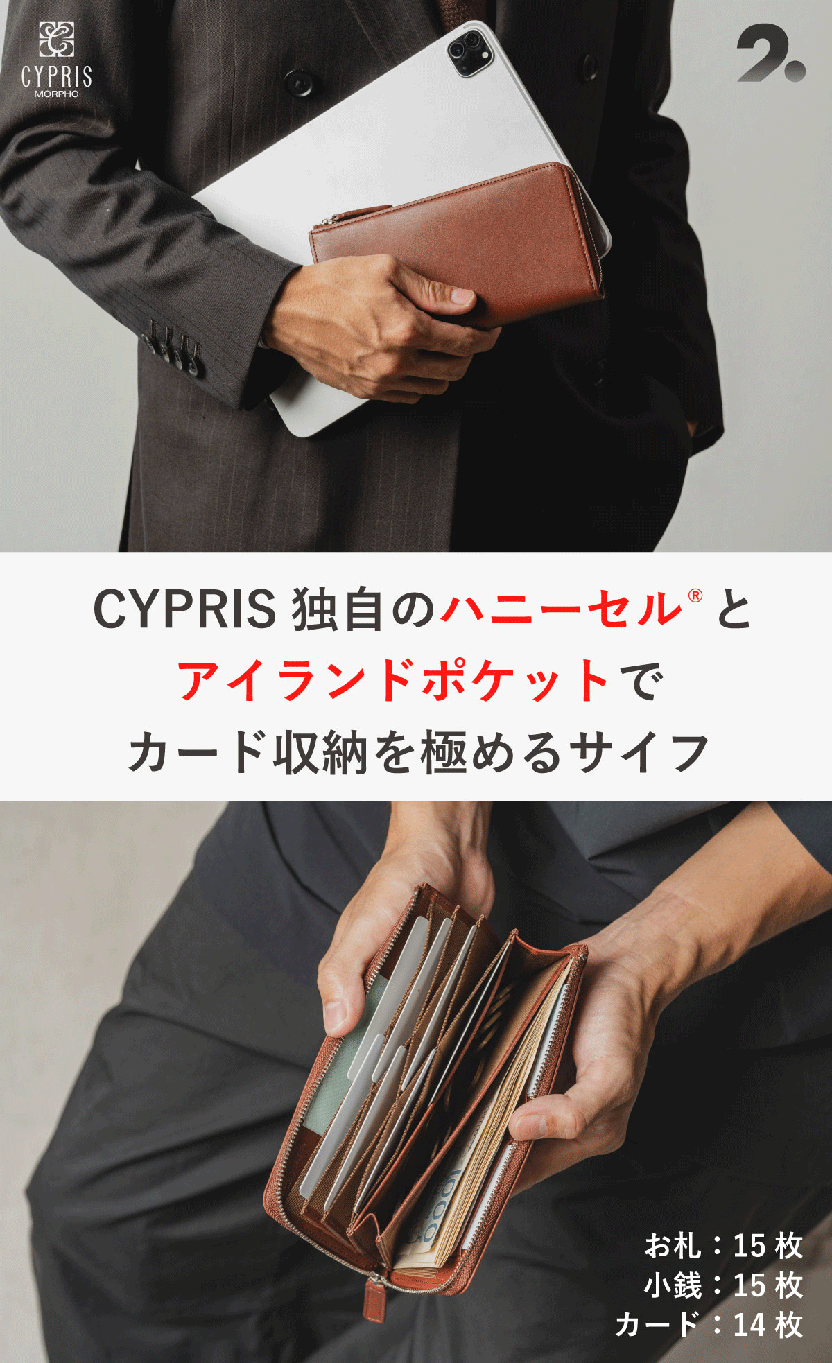 従来のキプリスの財布に搭載されているのは縦型のカードポケット構造ですが、「1ssi slim」には、横向き・短丈仕様にアップデートした「コンパクトハニーセル」を採用。