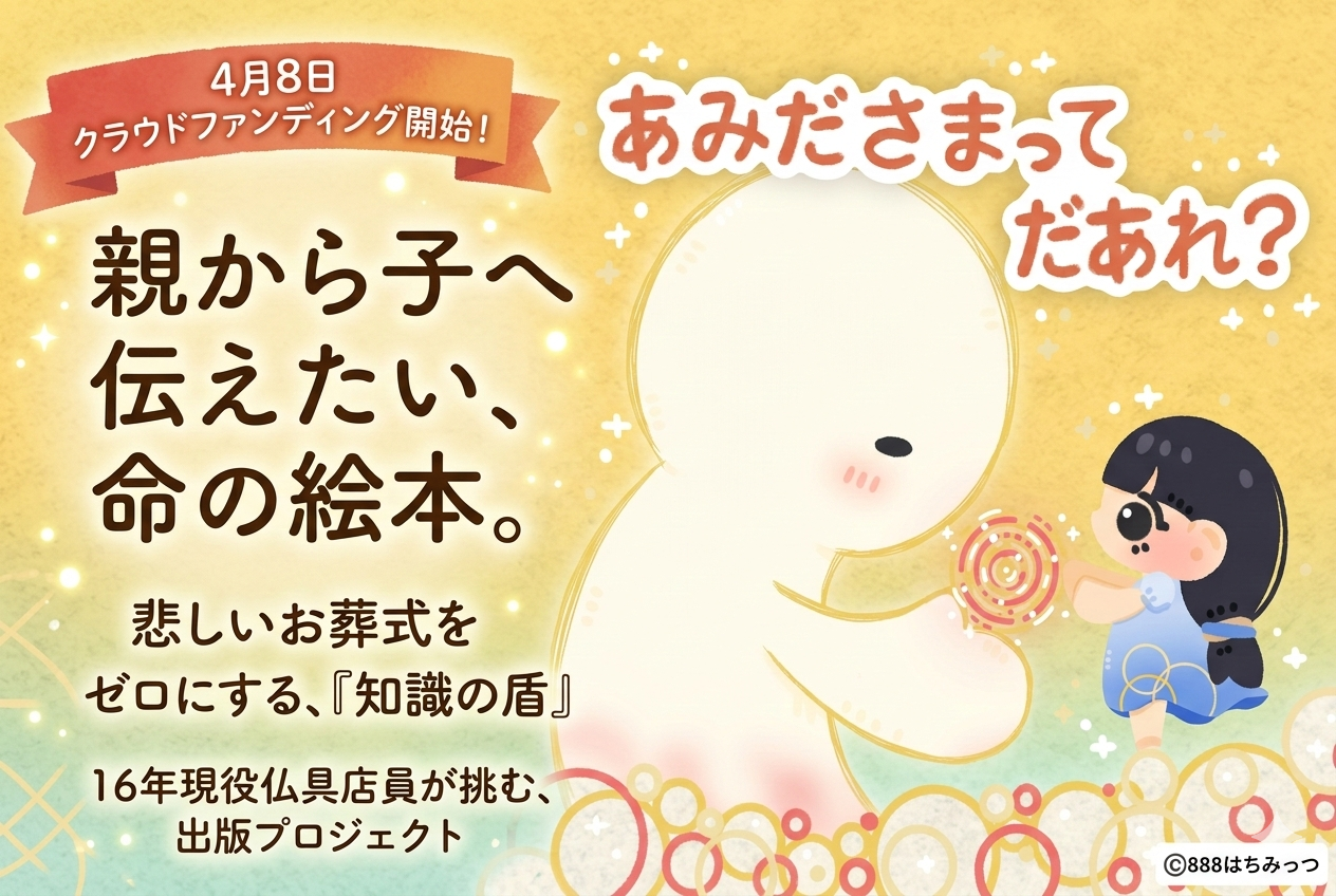 現役仏具店員歴16年以上のスギさんが、自費出版絵本『あみださまってだあれ?』の先行クラウドファンディングを4月8日(水)より開始。大切な人との別れに直面したとき、ご家族が迷いや後悔しないための「正しい知識の盾」となる、優しく温かい一冊。