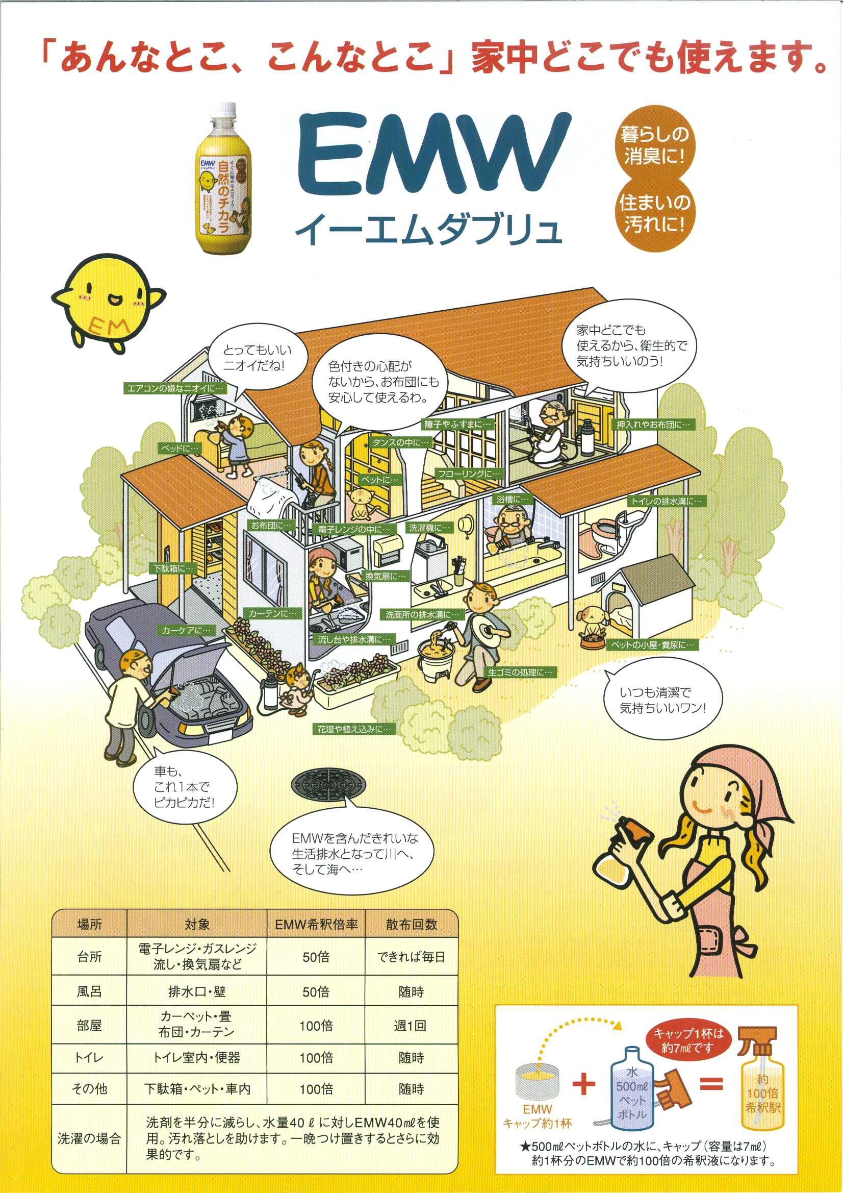 その他の効果として、台所や洗面所から「自然のちから EMW」を薄めた液を流すと、益液中に含まれたEMが下水を通って河川に流れ、水を浄化し環境をきれいにします。