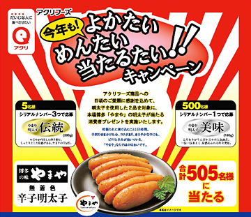 (株)アクリフーズは5月20日〜7月20日迄、弊社商品への日頃のご愛顧に感謝の気持ちを込めて、九州・博多″やまや″の辛子明太子が合計505名様に当たるクローズド懸賞を実施しております。