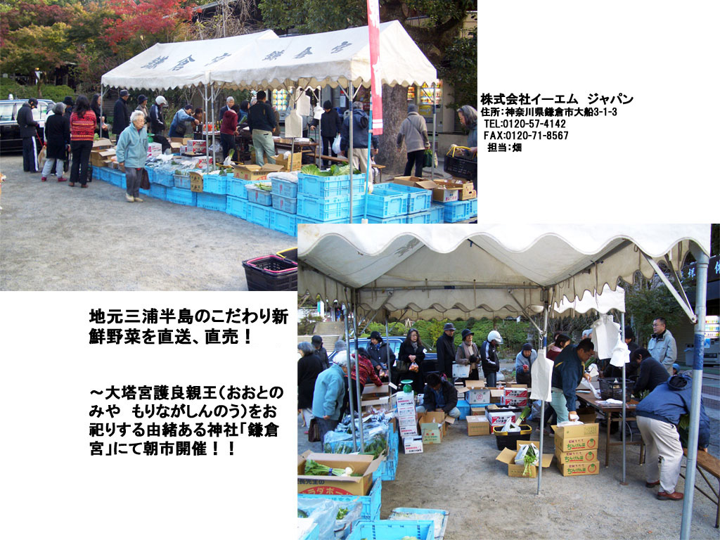株式会社イーエムジャパン(本社:神奈川県鎌倉市、代表:信國 祐介、以下イーエムジャパン)では鎌倉の歴史的な神社のひとつ、鎌倉宮で毎月一回朝市を開催しております。