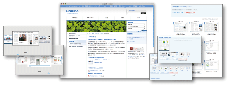 堀場製作所では、2004年から2009年現在までのCSR報告書「Gaiareport」のPDFファイルをコーポレートサイトで公開しています。今回、CSR報告書の日本語と英語版にPDFナビを導入したことで、これらのPDF文書をブラウザ上で快適に検索・閲覧・確認のできる有用性の高いコンテンツとして、お客様にご提供することが可能となりました。
