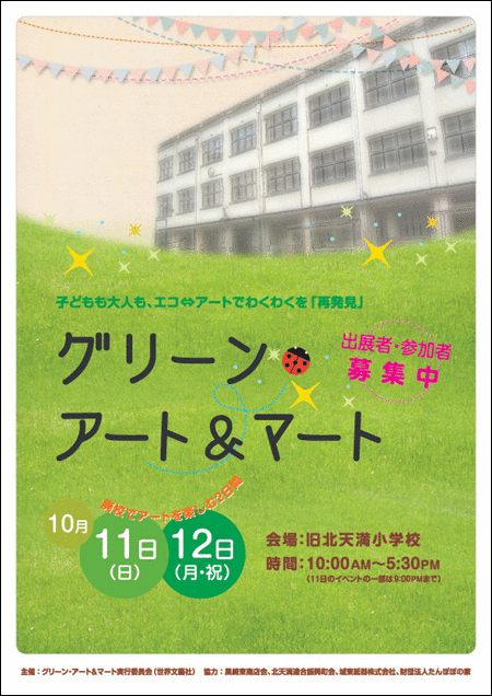 家族でエコに取り組もう!子供とアートを楽しもう!大阪の廃校を舞台にエコ&アートの視点からワクワクを再発見するイベント『グリーン・アート&マート』の出店・参加者を募集します! グリーン・アート&マート実行委員会(株式会社 世界文藝社)では、2009年10月11日(日)、12日(月・祝)、大阪市内にある廃校と芝生グラウンドを舞台にエコ&アートの視点から楽しみを再発見するイベントを開催するにあたり、アートマーケット及びワークショップの出店・参加者を募集します。