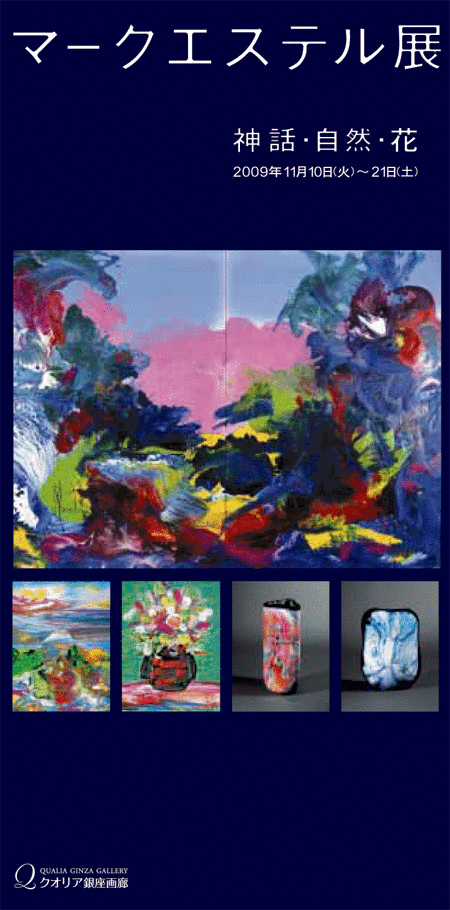 このたび、11月に行なわれる明治神宮への奉納(作品の奉納先としては37ヶ所目)を記念して、集大成となる個展をクオリア銀座画廊で開催します。会場では油彩画をはじめグラスや版画も展示。その詩情あふれる世界観、響きあう色彩美、西洋と日本の調和そして融合──。円熟の時を迎えたマークエステルの『神話』がここから始まります。多くの方のご来場をお待ちしております!