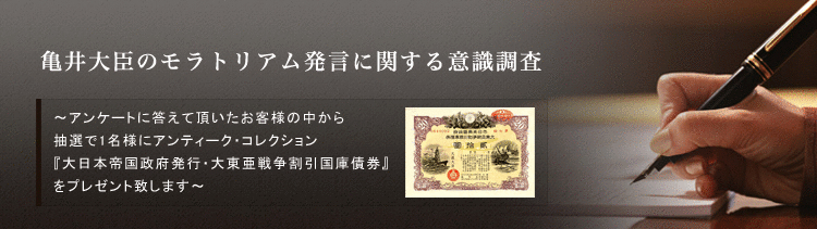 亀井静香大臣が提唱したモラトリアム発言について金融業界関係者は否定的な見解【亀井静香大臣が提唱したモラトリアム・意識調査キャンペーン結果を発表】 2009年11月20日~12月15日の期間において、HCアセットマネジメントが運営する、金融業界の中でも、特に機関投資家をはじめとする資産運用業界関係者向けコンテンツを集積した情報サイト『fromHC』のサイトユーザーへ向けて、亀井大臣の日本郵政社長に元大蔵事務次官を起用したトップ人事や中小企業等金融円滑法案の素案の是非について問う、『抽選でアンティーク・コレクション大東亜戦争割引国庫債券が当たる!亀井大臣のモラトリアム発言に関する意識調査キャンペーン』を実施致しました。
