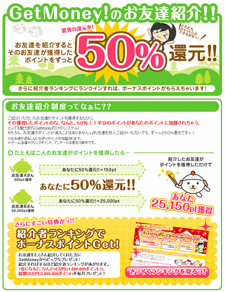 株式会社チャンスイットが運営する最強ポイントサイトGetMoney!( http://dietnavi.com/)で、1ユーザーがお友達紹介制度を利用して、貯めたポイント4,708,040円分をキャッシュバック申請いたしました(2009年12月申請)。