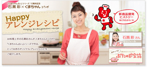 アクリフーズ  石黒彩さんオリジナルアレンジレシピサイトオープンのご案内 アクリフーズ「くまちゃん占い」シリーズのファンである石黒彩さんが、お弁当のおかずだけではなく、お子様の春休みのランチや普段の夕食のおかずにぴったりのアレンジメニューを考案、おいしく作れる「あやっぺからのワンポイント」も掲載しています。