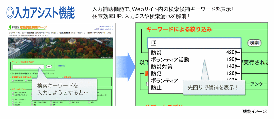 新宿区、「新宿区意識調査検索ページ」の検索を強化!ビジネスサーチテクノロジが実現!新機能の「入力アシスト」で検索候補キーワードを先回り表示!過去30年分の調査報告書を検索・閲覧!