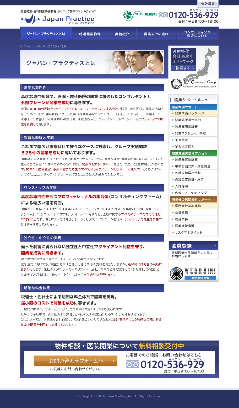 全国3,200超の医院をクライアントとするフォーユーメディカル株式会社が全国の医療特化会計事務所JPコンサルタンツ・グループ総人員550名とプロジェクトチームを組み、開業後の医院経営を見据えた開業コンサルティングサービス「ジャパン・プラクティス」を提供。医療物件・医院開業について、コンサルティングファームならではの独立性・中立性・専門性で開業を成功に導きます。