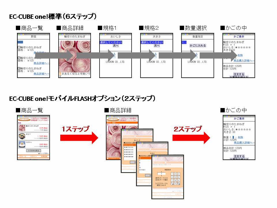 これにより、「EC-CUBE one!」において、需要が最も高いモバイルネットショップサイトのリッチコンテンツ化における開発負荷を軽減することで、短期間、低工数でFlash Liteに対応したモバイルネットショップサイトの構築を実現します。