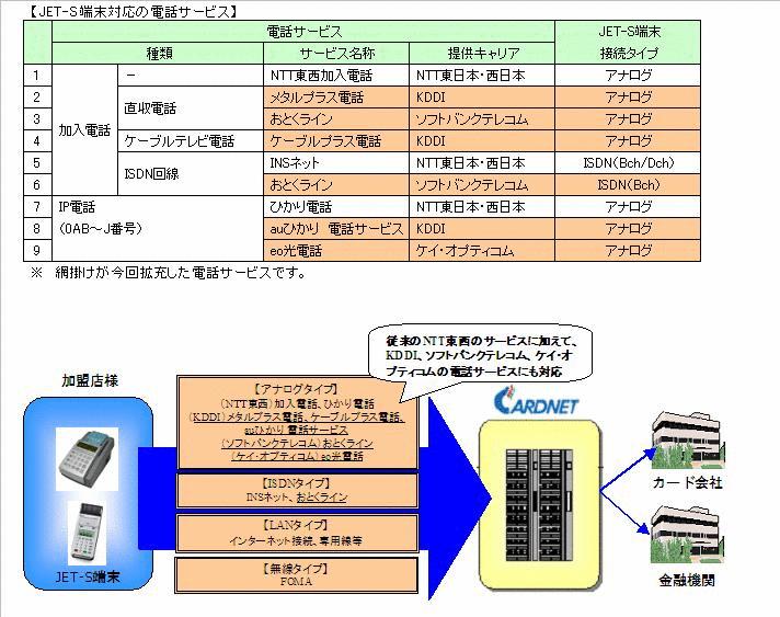 クレジット決済端末 JET-STANDARD対応電話サービスの拡充 クレジット情報処理センター大手の株式会社日本カードネットワーク(本社:東京都港区、代表取締役社長:古山 松男、略称:CARDNET)は、2010年6月14日よりクレジット決済端末『JET-STANDARD』(ジェットスタンダード、以下JET-S端末)で利用可能な電話サービスを拡充します。