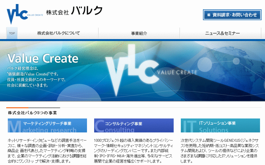 バルク:コーポレートサイトリニューアルオープンのお知らせ。マーケティング・コンサルティング・ITソリューションの3分野を主軸にサービス大幅拡大
