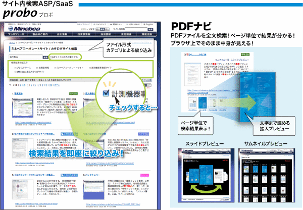 ミネベアが、Webサイトの検索機能を刷新!BSTの「probo(プロボ)」を導入して「見やすい」「探しやすい」サイト内検索を実現!PDF検索・閲覧のユーザビリティが向上! 検索エンジンの研究開発・販売・ASP/SaaS提供およびソフトウェア研究開発・コンサルティングのビジネスサーチテクノロジ株式会社(本社:東京都千代田区、代表取締役CEO:城野洋一、以下「BST」)は、ミネベア株式会社(本社:長野県北佐久郡御代田町、代表取締役 社長執行役員:貝沼由久、以下「ミネベア」)が、ミネベアコーポレートサイトおよび、カタログサイトに、BSTのサイト内検索ASP/SaaS「probo(プロボ)」を導入したことを発表いたします。