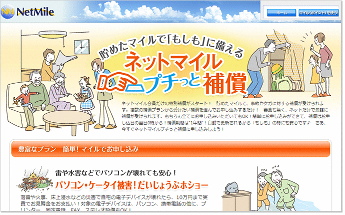 ネットマイル社、貯めたポイントで「もしも」に備える「ネットマイル プチっと補償」サービスを開始  インターネット上の共通ポイントプログラムを運営する株式会社ネットマイルは、少ないポイントで事故や怪我に対する補償が受けられるサービス「ネットマイル プチっと補償」を、本日2010年7月13日(火)14:00より開始いたします。