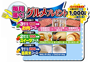 アクリフーズ 2010年秋季 『毎月届く! グルメプレゼント』実施のご案内 アクリフーズの人気スナック商品5品(ピザ3品、グラタン2品)を対象とした3ポイント、2ポイント、 1ポイント応募のクローズド懸賞を実施、3ポイント応募は、佐賀産和牛など3回お届け!お肉コースを100名様に2ポイント応募は、本格フレンチ店のチーズケーキなど3回お届け!スイーツコースを100名様に1ポイント応募は、佐賀県産銘柄米“ゆめしずく“など2回お届け!銘柄米コースを200名様に、抽選でプレゼントいたします。