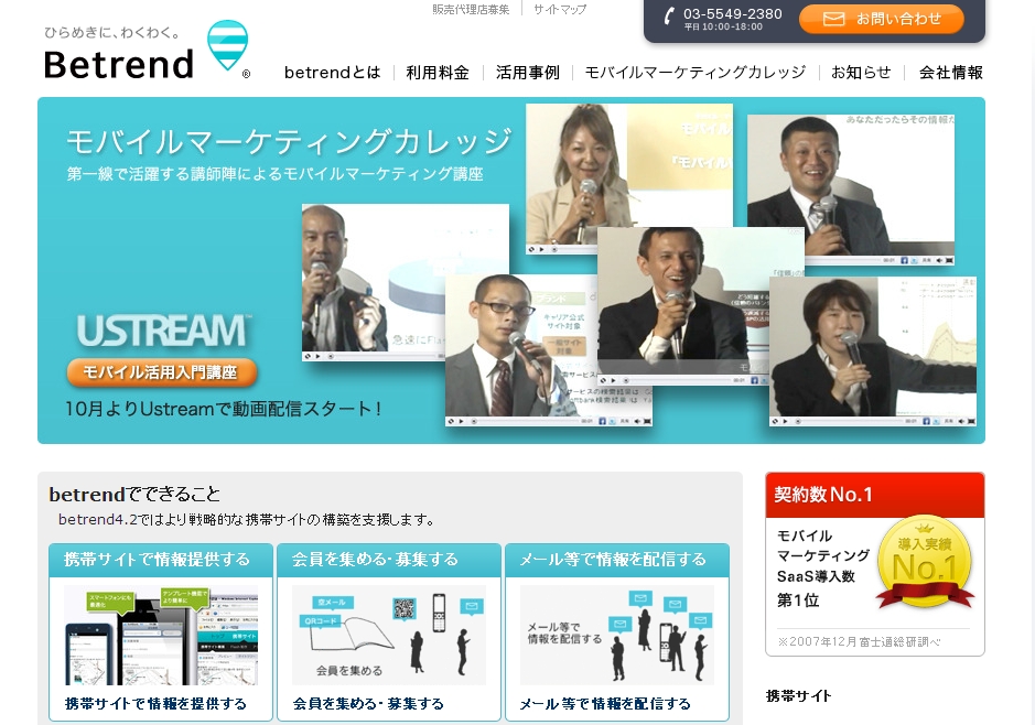 betrendとは、ビートレンドが提供している、携帯向け販売促進用ツール群の総称です。『携帯サイトを作る』、『携帯にメールを配信する』、『携帯サイトで商品を販売する』、といった企業や店舗における携帯電話を利用した販売促進施策を強力に支援します。3ヶ月に一度、定期的なバージョンアップ実施しており、進化し続けるモバイルマーケティングシステムとして、顧客企業からの圧倒的な支持を得ています。