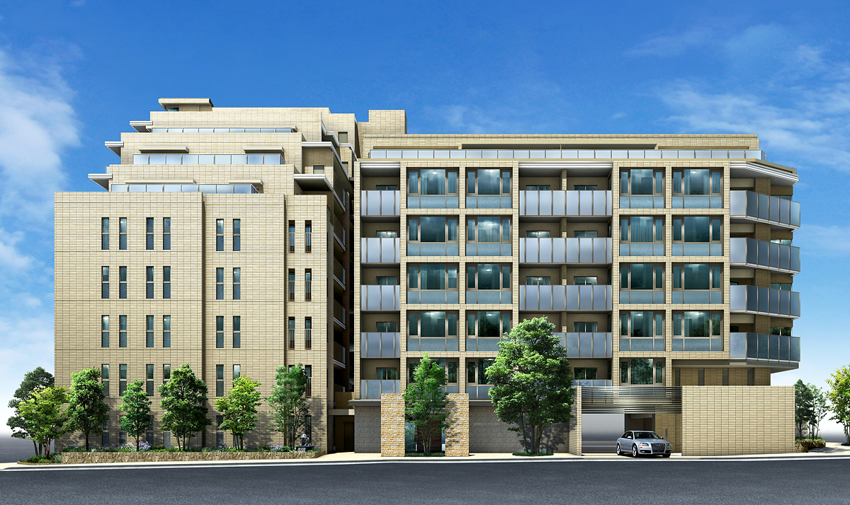 水平・垂直ラインやフレームなどをリズミカルに構成し、美しいまとまりのある外観デザインとしました。邸宅としての上質感を演出するため、素材感にこだわりシンプルに仕上げています。御影石を加工する石屋が集まっていたことから石屋川と呼ばれるようになったという由来をもつ地。その記憶を継承し、明日へと語り継がれて行く邸宅とするため、エントランスまわりには御影石を採用。南棟・東棟の2棟構成としたフォルムは、やさしい印象を広げるベージュの上質な45四丁掛タイルを用いた端正な表情。バルコニー手摺には透明感を演出する乳白ガラスを採用し、清涼感のあるモダンな佇まいとしました。また、総合設計制度を採用することで、この街並みに四季を感じる豊かな緑と開放的な空間を実現し、住まう方はもちろん、周辺の方にも憩いと潤いを与える建物です。