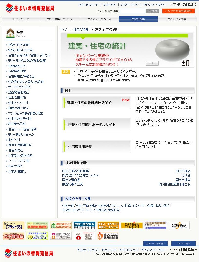住まいに関する情報の公的ポータルサイト「住まいの情報発信局」に、特集コーナー「建築・住宅の統計」をリニューアル開設。5つのテーマ別に、わかりやすく紹介。クイズキャンペーンも実施