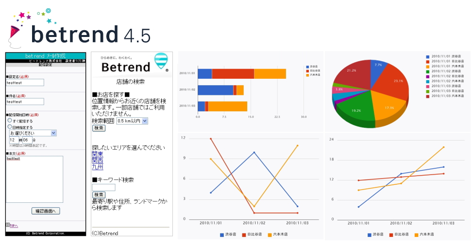 スマートフォン用管理画面・GPS検索等に対応した『betrend 4.5』をリリース 携帯向け総合販促SaaS『betrend』を提供するビートレンド株式会社(本社:東京都港区、代表取締役社長:井上英昭、以下ビートレンド)は、11月25日(木)に『betrend』の定期バージョンアップを実施いたしました。今回リリースした『betrend 4.5』では、スマートフォン対応のメール配信用管理画面、GPS対応店舗検索機能、会員情報集計機能の強化など、作業効率向上・分析機能の強化を中心とした内容となっています。