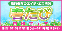 “春たび応援フェア”開催のお知らせ エイチ・エス損害保険株式会社(所在地:東京都新宿区 代表取締役:松尾昭男)では、春季旅行シーズンに向けた“春たび応援フェア”を、2010年12月21日(火)から2011年3月17日(木)の期間で開催いたします。