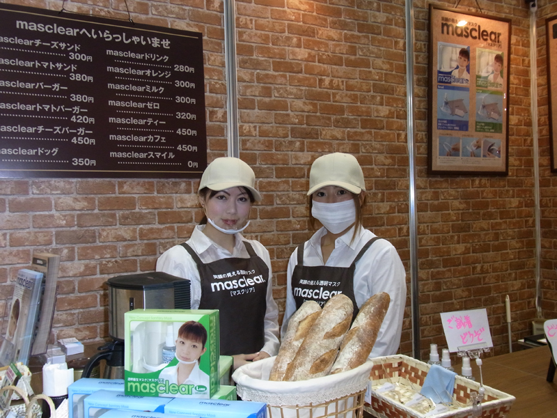 東急沿線のベーカリーショップで採用が進んでいる、笑顔の見える透明マスク『masclear(マスクリア)』を一人でも多くの皆様に、体感・体験して頂けるように、ブース自体をカフェベーカリー風にしています。また、カウンター内には、透明マスクと不織布マスクを着用したショップ店員がお待ちしており、一目で笑顔の見える透明マスク『masclear(マスクリア)』が良いと絶対に体感して頂けます。